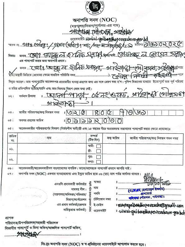জনাব মোঃ আব্দুল হানিফ সরদার, পৌরনিবাহী কর্মকর্তা’র অনাপত্তিপত্র